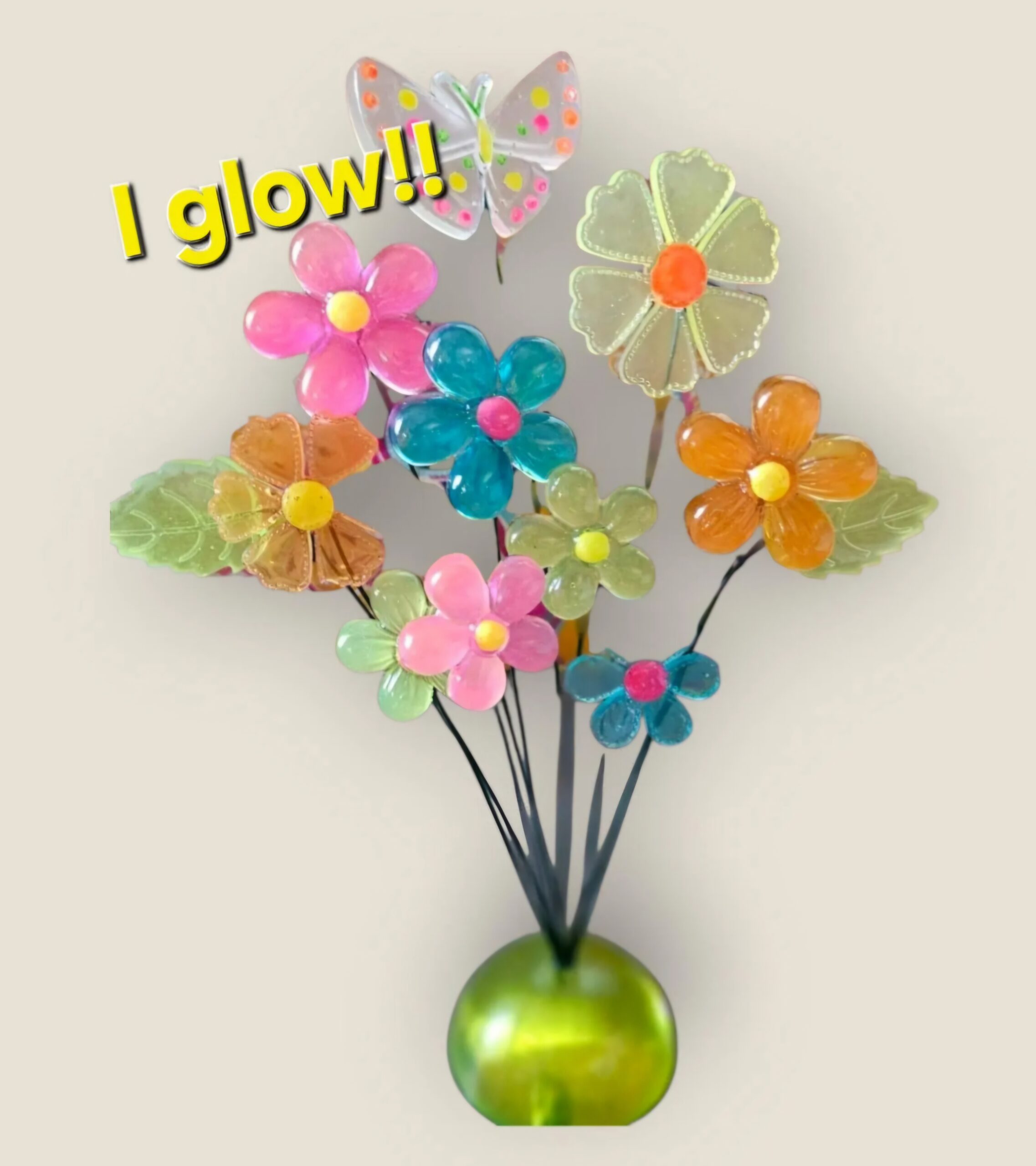This listing is for a domed Glow in the Dark base and and It has 10 GLOW in the Dark flower stems and 2 leaves and a butterfly.