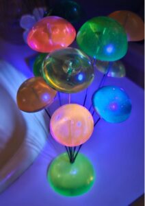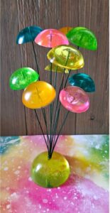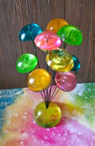 It has 10 wire stems that are about 10″ and 8″ tall. Neon color “gumdrops” are at the end of each wire. They wiggle when touched or blown with air.