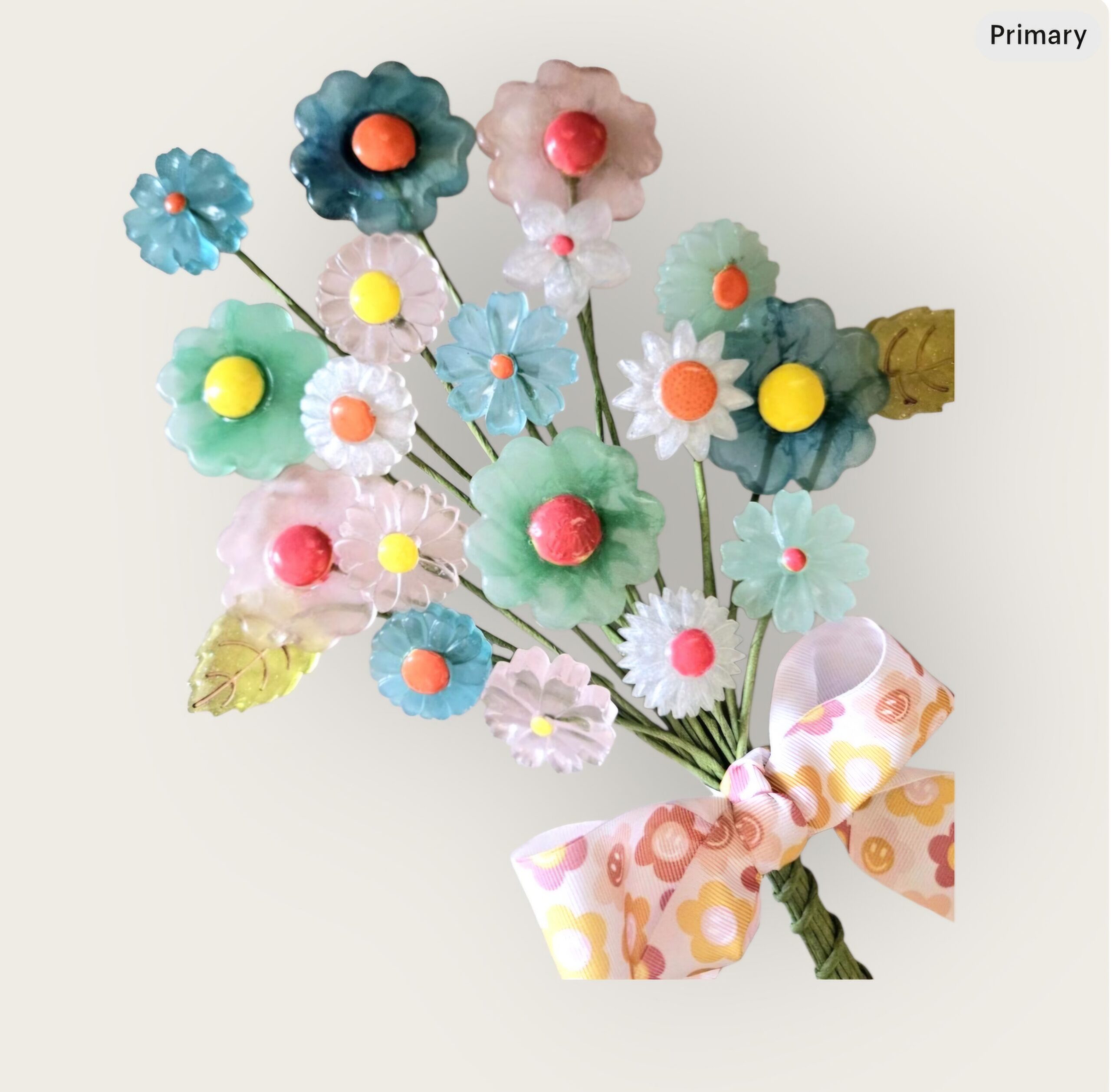 HAND POURED RESIN Vintage 1970’s style Acrylic Flowers. This is a BIG piece! The medium size flowers are about 1 1/2″ and the small are the size of a quarter. You get 6 medium and 17 small, with 2 leaves.