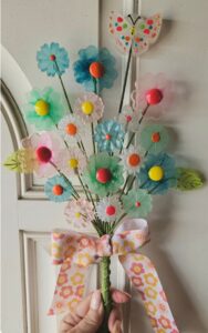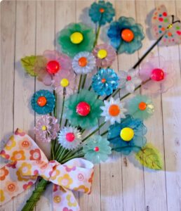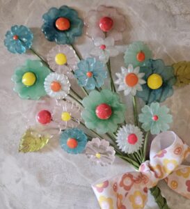 Each flower is hand poured into repro molds using all kinds of funky colors and lots of sparkle! They are drilled and glued onto a floral wire that can be bent for your own placement in your vase. Each flower is a one of a kind.