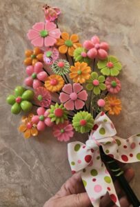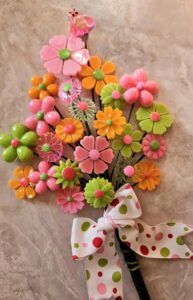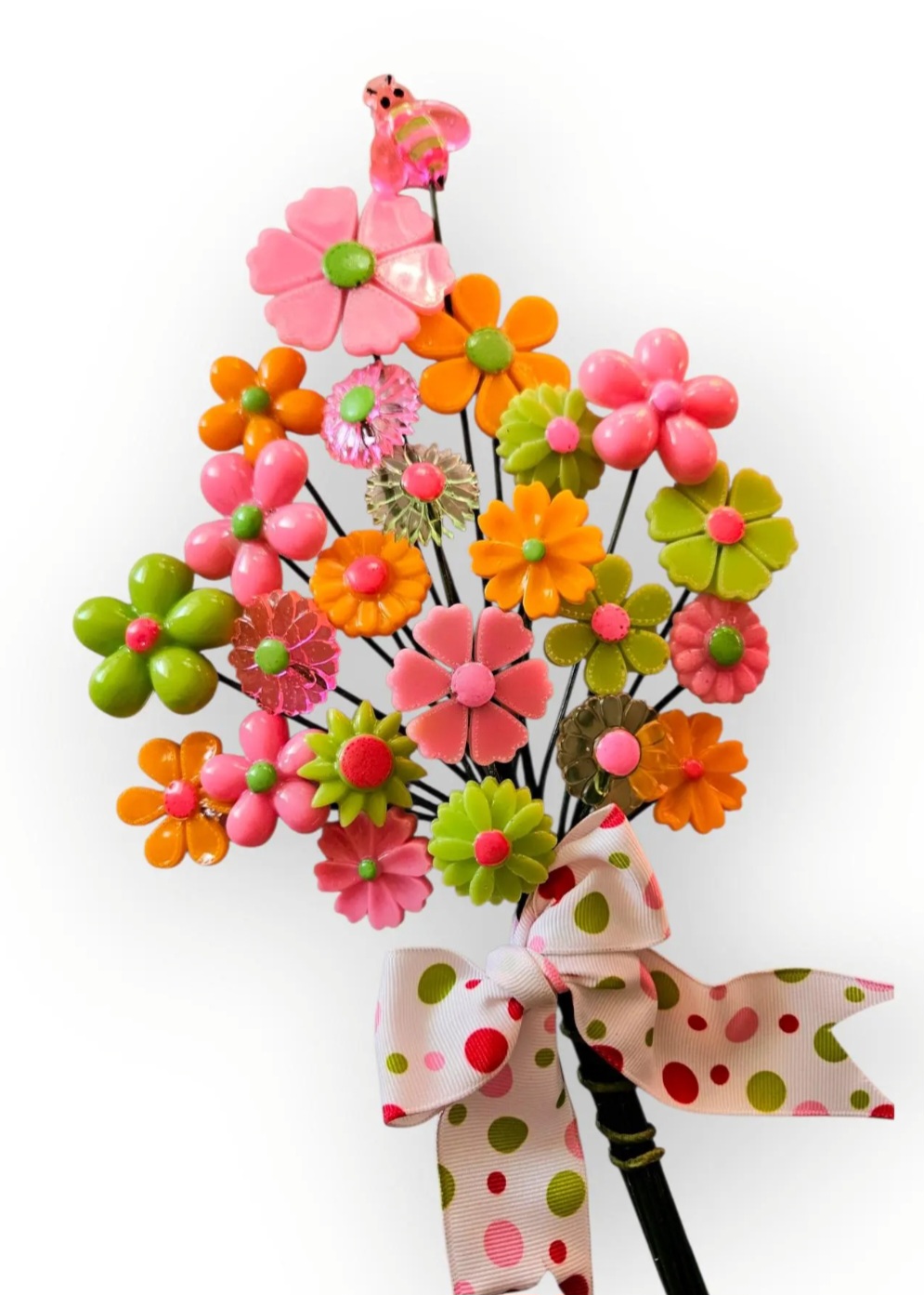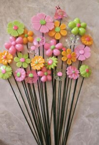 Each flower is handpoured into repro molds using all kinds of funky colors and lots of sparkle! They are drilled and glued onto a floral wire.