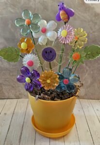 This is a 4″ plastic flowerpot. The flowers are secured in Styrofoam and are about 9″ tall. Flower colors may vary.
