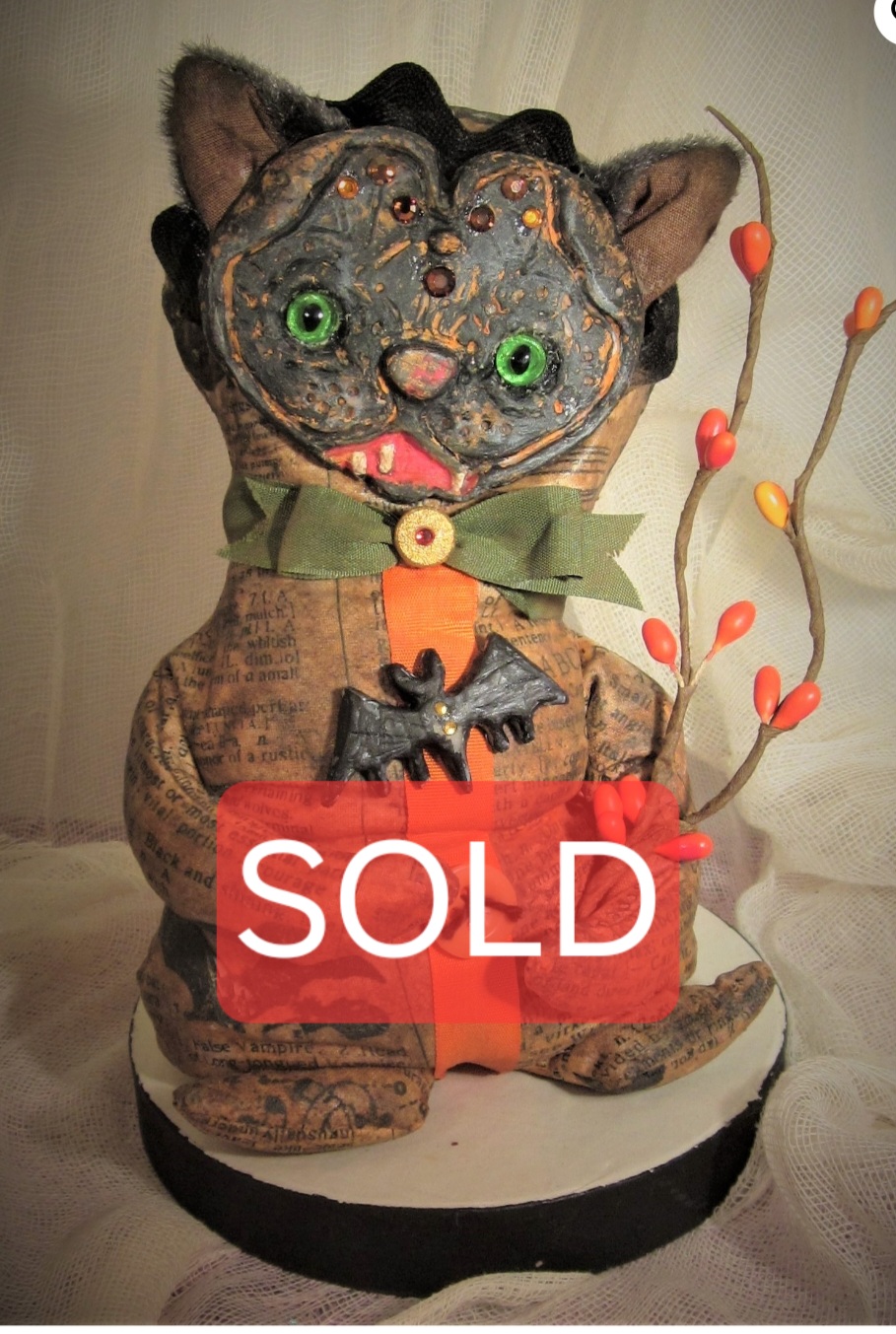 Please meet MR. CREEPS! He wears vintage velvet ears, vintage ribbon and buttons. He holds a sprig of bittersweet. Beautiful handpainted German glass eyes!