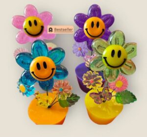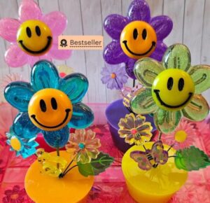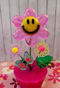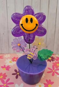 Each flower is handpoured into repro molds using all kinds of funky colors and lots of sparkle! They are drilled and glued onto a flower stem. Each flower is a one of a kind.