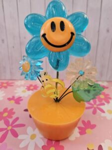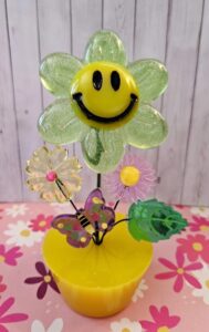 The large happy face flower is over 3″ in diameter. It is very bright and bold. There are 2 tiny flowers, a leaf and a bug. The resin flowerpot base is 3″x 2″ tall. The piece measures about 6″ to 7″ tall.
