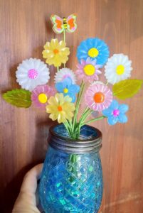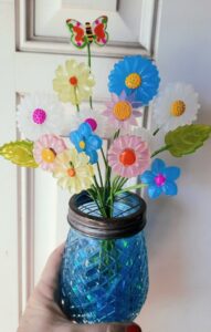 included in this arrangement are 3 medium stems, and 10 small frozen flowers. The Mason jar glass vase is about 6″ tall and are available in 3 colors. There are also 2 leaves and a bug 🐛