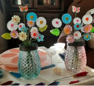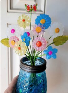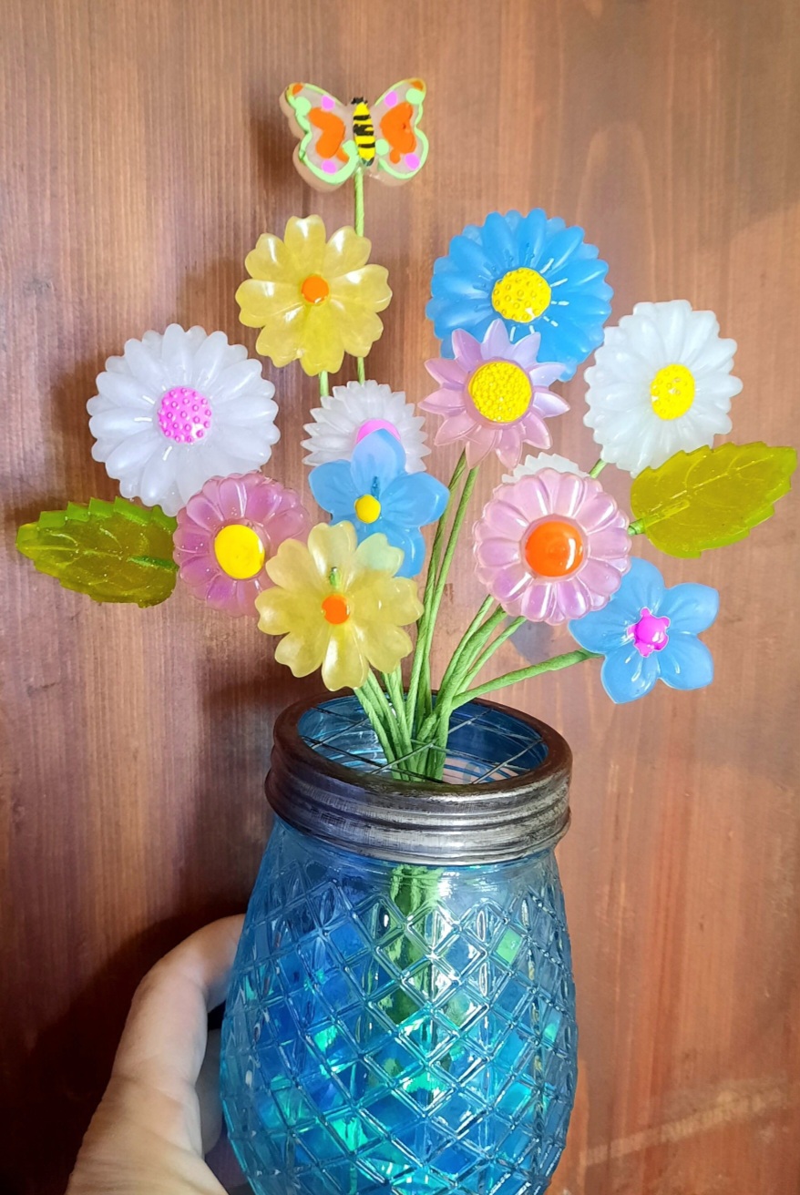 Each flower is handpoured into repro molds using all kinds of funky colors and lots of sparkle! They are drilled and glued onto a floral wire. Each flower is a one of a kind.