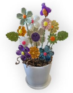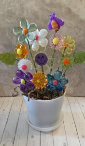 This is a 4″ plastic flowerpot. The flowers are secured in Styrofoam and are about 9″ tall.