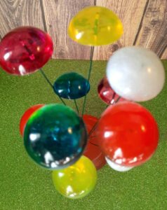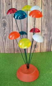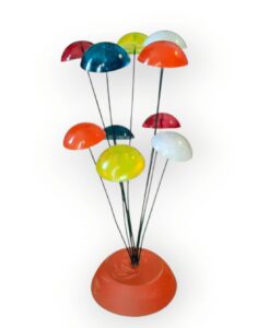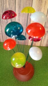 It has 5 wire stems that are about 10″ tall and 5 stems that are 6″. Color “gumdrops” are at the end of each wire. They wiggle when touched or blown with air.