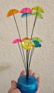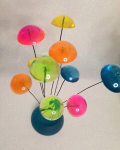 It has 10 wire stems that are about 10″ and 6″ tall. Neon color “gumdrops” are at the end of each wire. They wiggle when touched or blown with air.