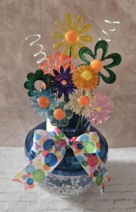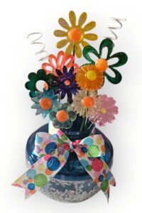 This is a 4″ plastic glitter cup. The flowers are secured in Styrofoam and are about 9″ tall. The pot is filled with tule. You get 10 small flowers 😊. They are lots of fun flower shapes. I have added squiggly wires for accent.
