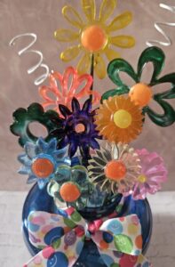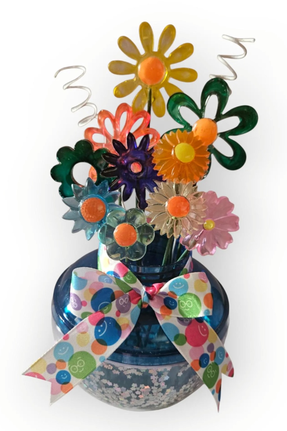 Each flower is handpoured into repro molds using all kinds of funky colors and lots of sparkle! They are drilled and glued onto a floral wire. Each flower is a one of a kind.